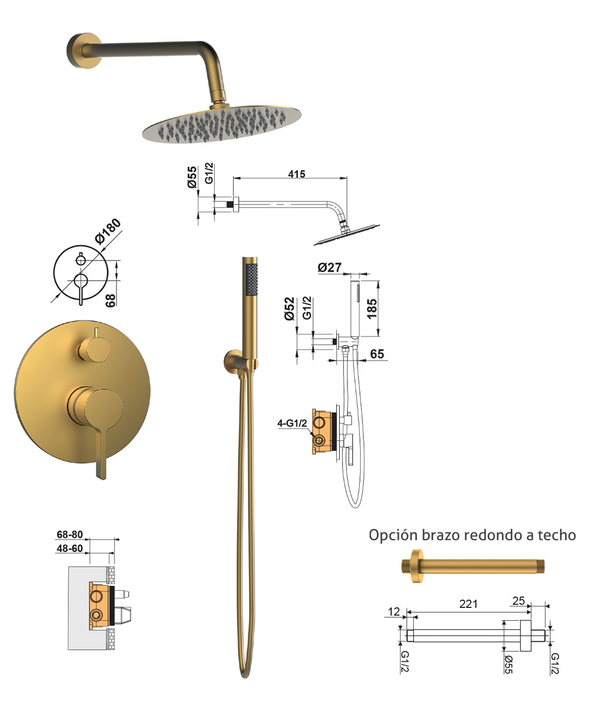 Cartucho desviador 29 mm Ref. CG5130000S000029, Cartucho monomando 35 mm Ref. CG0170000S000135, Opción brazo redondo a techo Ref. BC240 36.