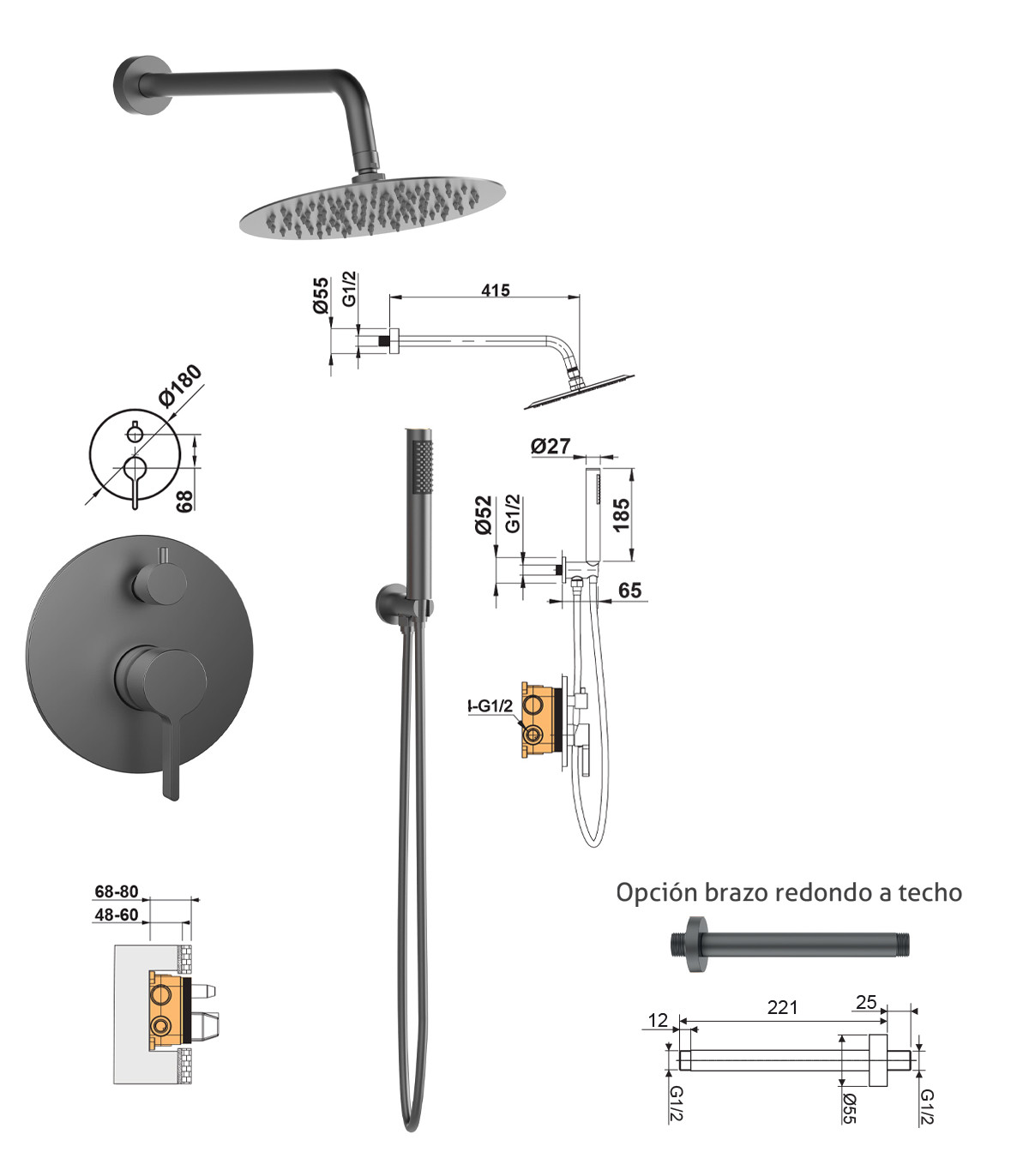 Cartucho desviador 29 mm Ref.CG5130000S000029, Cartucho monomando 35 mm Ref. CG0170000S000135, Opción brazo redondo a techo Ref. BC240 34.
